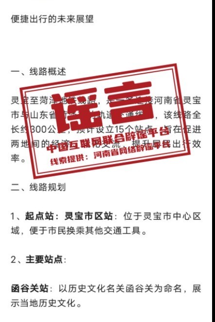 真相:近日,有自媒体账号在互联网平台发布“灵宝到菏泽的地铁”相关信息,称“该线路全长约300公里,预计设立15个站点”“起点站为灵宝市区站,位于灵宝市中心区域”,引发关注。经核实,该消息系虚假信息。互联网不是法外之地,请自觉遵守法律法规,不造谣、不信谣、不传谣。(来源:“清朗河南”微信公众号、网信灵宝)